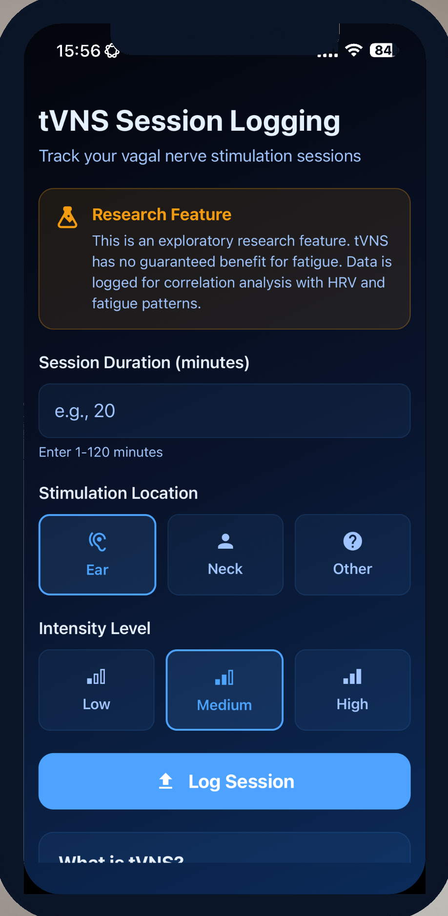 FatigueSense includes research features like tVNS (transcutaneous vagal nerve stimulation) session logging. If you use a tVNS device, log your sessions and FatigueSense will analyse correlations with your HRV and fatigue patterns.